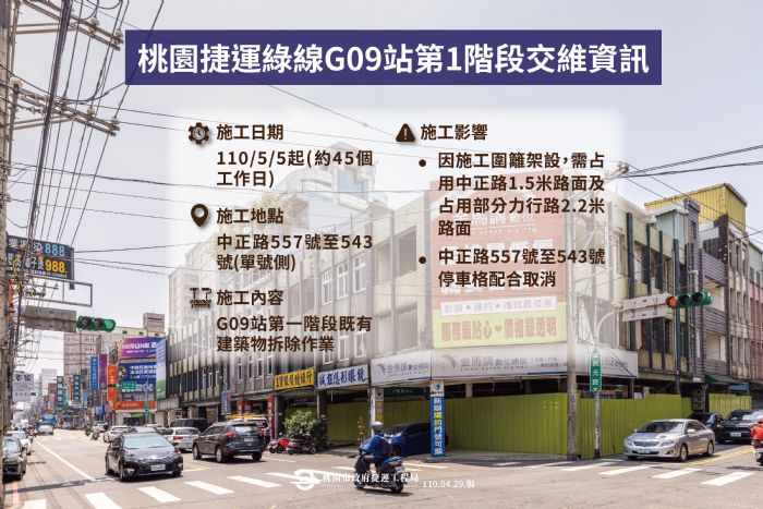 桃園區中正路557號至543號(單號側)為桃園捷運綠線GC03標G09站體範圍內已取得之捷運必要設施用地,預計自110年5月5日起進行第一階段既有建物拆除工作,因施工圍籬架設,路邊停車格取消,請民眾配合相關交維措施。