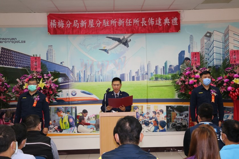 桃園市政府警察局楊梅分局於30日在新屋分駐所舉行新任所長佈達交接典禮,由分局長黃富村親自主持,轄區市議員、義警、民防、義交、守望相助隊、志工中隊、里長、警友站等地方士紳到場觀禮。