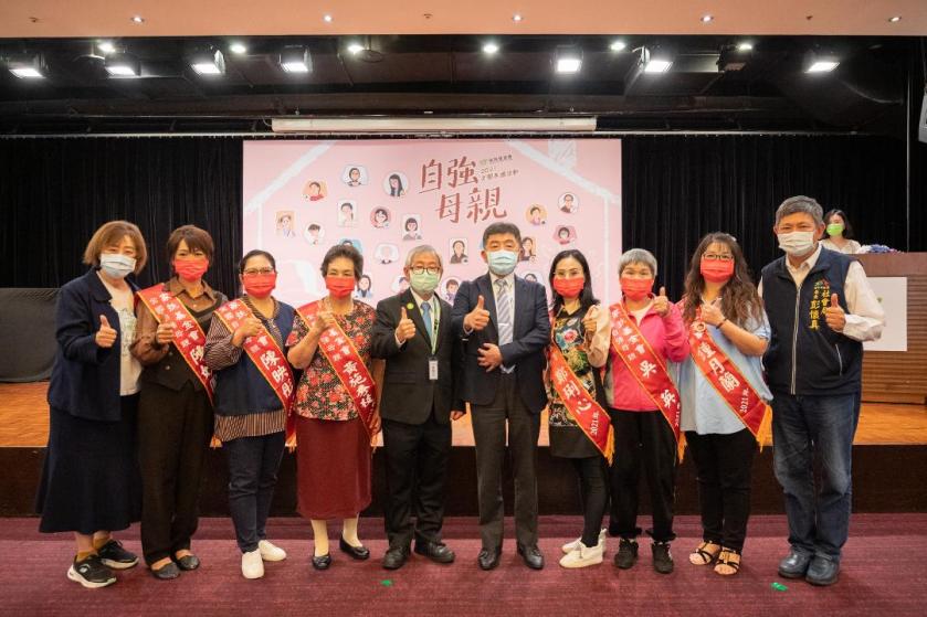 衛生福利部部長陳時中(中)頒贈獎牌給家扶基金會全國自強母親陳映彤(左三)