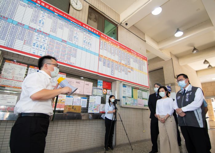 桃園市長鄭文燦15日上午前往桃園客運桃園總站,視察客運場站防疫作為,鄭市長表示,桃客公司防疫對策做得很到位,包括車站和乘客易碰觸的地方1小時消毒1次,以及單趟次載運完成後進行車輛消毒等,對於司機的健康管理,也以雲端系統紀錄司機的酒測、體溫及血壓狀況,確保司機健康無虞。