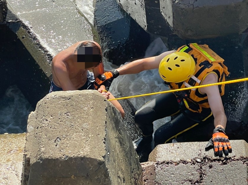 海巡署第三(桃竹)巡防區指揮部16日16時15分,接獲桃園市政府消防局通報,竹圍漁港南堤有民眾於岸際戲水時,因海流影響受困消波塊,隨即派員救援,經各單位合力搶救後幸無大礙。