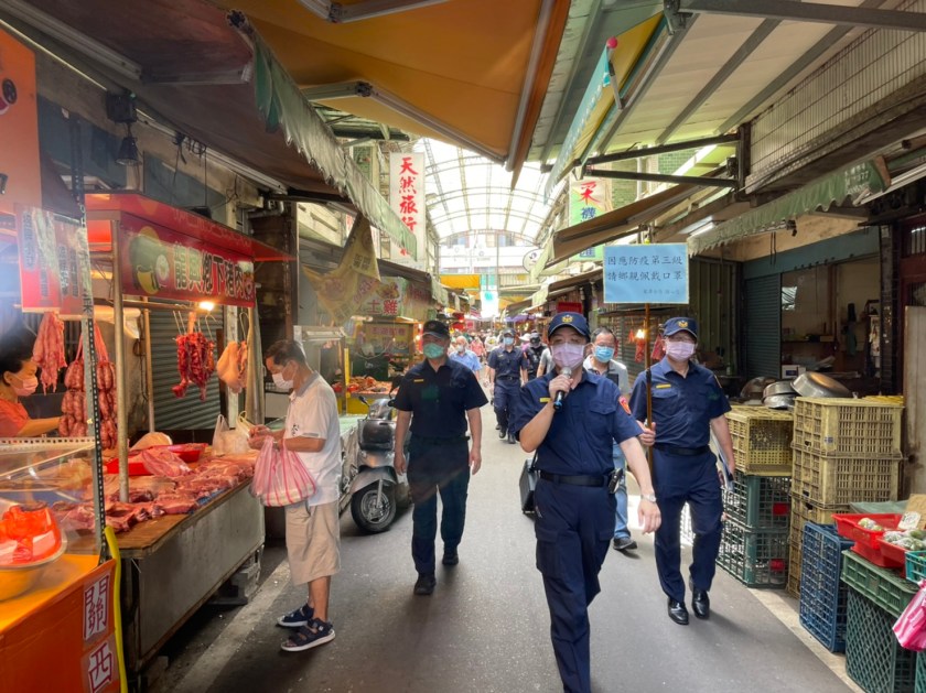 龍潭傳統市場日前發生確診個案足跡,龍潭分局分局長陳清華率隊於20日於人潮聚集之龍潭傳統市場、龍潭老人會館等公共場所逕行執行稽查取締。