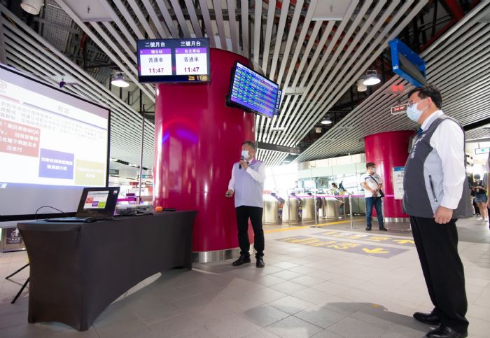 桃園市長鄭文燦(21)日上午前往機場捷運A18高鐵桃園站視察簡訊實聯制實施情形及防疫整備,鄭市長表示,為保障乘客健康安全,機場捷運及市區公車全面採取實聯制,機捷也自5月19日起,於全線21車站詢問處及出口閘門設置由行政院開發之「簡訊實聯制QR Code」系統,方便購買單程票乘客使用。另外,機捷也鼓勵乘客使用記名電子票證、行動支付或桃捷通勤定期票乘車,既方便快速又能降低接觸傳染風險。