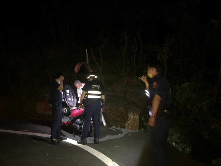 剛好迴龍派出所警員曾子軒、粘凊紋、黃靖誠巡邏經過該處,見老翁站立該處機車倒地,上前關懷才知道老翁困境先將其機車扶正牽引到路邊,深夜山區流浪野狗又多,機車再次發動後冒白煙恐有行車安全疑慮,員警以巡邏車載老翁,員警騎乘機車ㄧ起回到派出所。