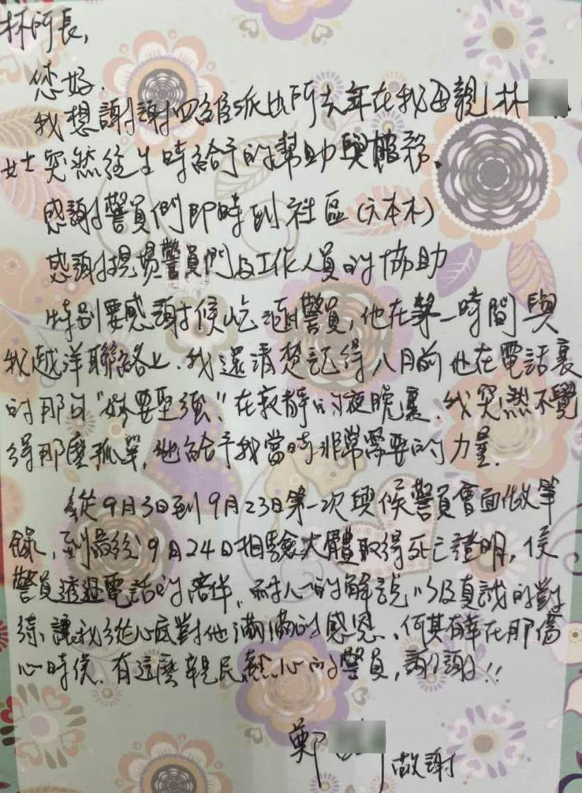 鄭女士返美後,感念警察之辛勞,親筆書寫信函,向派出所表達感謝之意,於信件內容特別提及侯姓員警,即時協助妥適處理外,並於聯繫過程中還給予溫暖陪伴的力量,渡過傷心的時刻。派出所員警於24日接獲此信件,感受到民眾滿滿的感謝與正面支持,在這疫情忙碌的時刻,注入一股暖流。