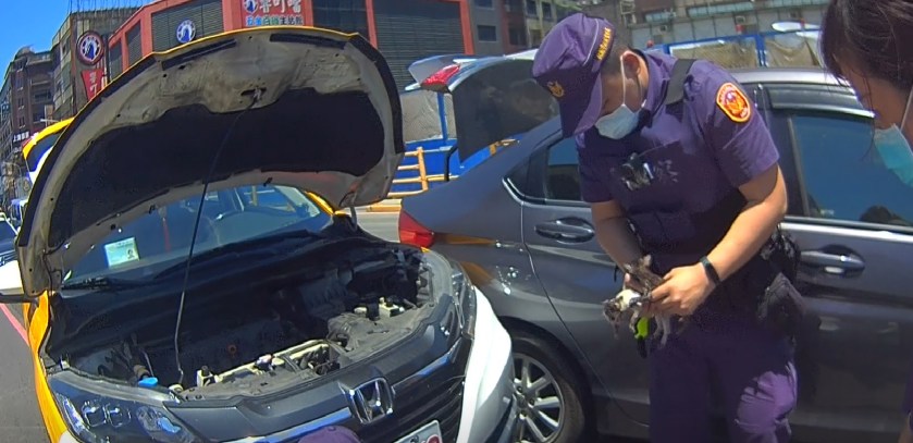 員警趕赴現場後,見貓咪因高溫又害怕而蜷縮身體,不斷發抖,員警見狀立即與計程車司機討論營救幼貓的方式,最後經車主同意後,使用小刀破壞保險桿下方,將三隻小貓咪從保險桿內凹槽縫隙安全抱出,並在過程中不斷安撫牠們,試圖減緩貓咪因恐懼害怕的情緒,所幸貓咪只有輕微的中暑,所幸經補充水分及充分休息後並無大礙,恢復精神的三隻幼貓,開始抬頭四處走動後,讓警員鬆了一口氣,民眾感謝警方熱心協助,成功挽救三隻幼貓寶貴的生命。