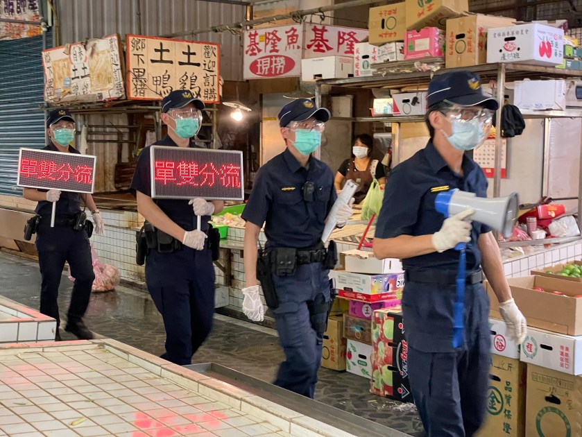 平鎮警分局行政組組長盤新枝表示,因為傳統市場人潮較多,很容易形成隱形的傳播鏈,全國各縣市也針對傳統市場都進行分流管制計畫,桃園市政府自即日起實施這項政策,警方也將配合市府防疫措施,針對佩戴口罩、禁內用、不群聚等3原則進行稽查。