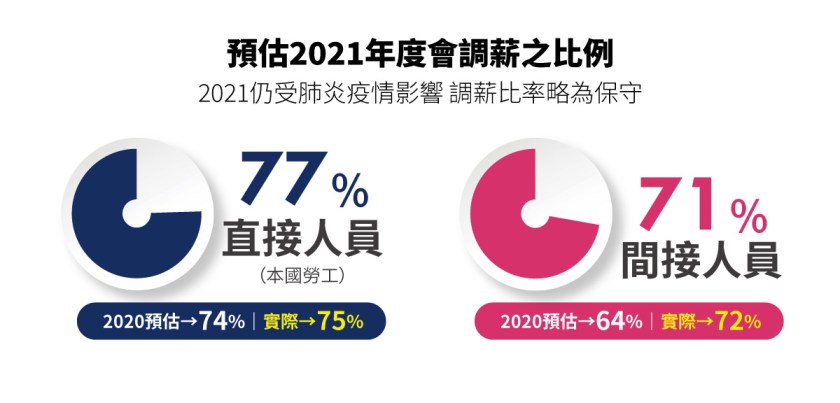 依調查報告整體來看,企業調薪主要考量因素,仍以「企業年度獲利」為主。預估2021年參與調表企業7成會調薪;直/間接人員預估調薪幅度皆以「3.0-3.9%」最多,分別為24%與22%。值得關注的是,預估不調薪直接人員27%;間接人員29%。完整報告內容含括「產業別」與「區域別」分析。