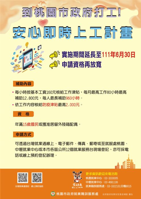 桃園市自109年4月計畫開始至110年6月17日止已推介媒合2,829人上工,下半年預計再釋出約1,600個工作機會,工作內容包含文書整理、環境清潔及防疫相關工作等,有需求民眾可至台灣就業通網站(www.taiwanjobs.gov.tw)線上申辦,或可採電話或線上洽詢預約登記(登記網址:https://reurl.cc/rxZgeb),就業中心受理申請後將主動與民眾聯繫,迅速安排上工;亦可以郵寄、傳真、電子郵件等方式,將申請相關文件寄送至本市就業中心、就業服務台辦理(本市就業服務據點資訊:https://reurl.cc/O0pGg7)。更多資訊歡迎來電洽詢桃園就業中心(電話:03-3333005)、中壢就業中心(電話:03-4681106)或就業職訓服務處(電話:03-3322101分機8015)。