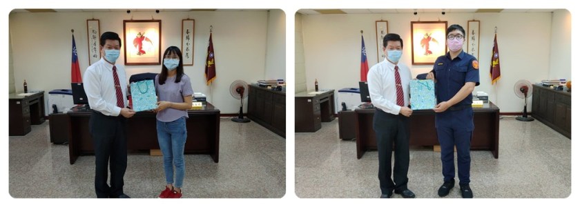 分局長陳百祿及警友辦事處主任劉元順獲悉頡承及湘舜努力充實自我,達成人生階段目標後,除了準備紀念品鼓勵兩位同仁的好表現,也希望其未來在新的領域繼續貢獻所長,並期望還在崗位的同仁們也能多多充實自己,努力為各種不同的人生目標邁進。