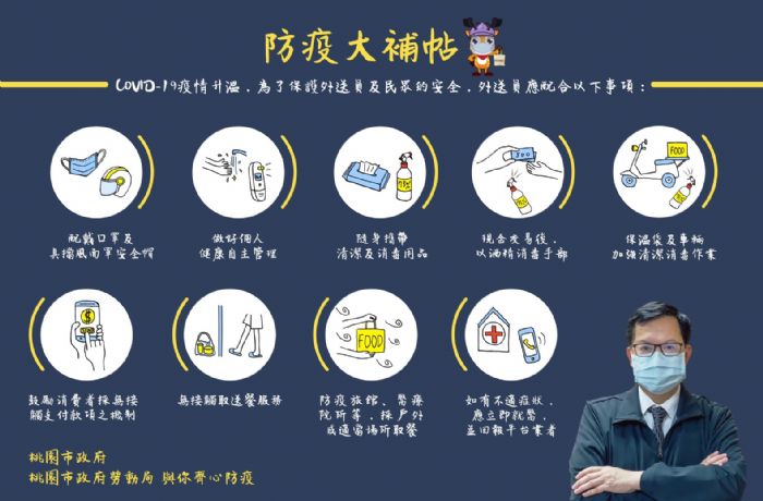 全台三級警戒,造成民眾外送點餐需求增加,為了保護食品外送業者及民眾的健康安全,桃園市政府特別製作「外送服務防疫大補帖」,並發布各媒體社群平台,以加強外送員防疫作為,並請民眾朋友們配合相關防疫措施。