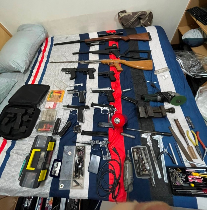 副分局長詹枝松表示,警方查獲金牛座手槍1支、長槍1支、空氣長槍2支、空氣手槍2支、槍管3支、手槍零組件1批、子彈5顆、改造工具萬力夾具1組、電鑽1支、砂輪機1支、鑽頭一批、研磨及改造工具各一批,以及安非它命吸食器等證物。