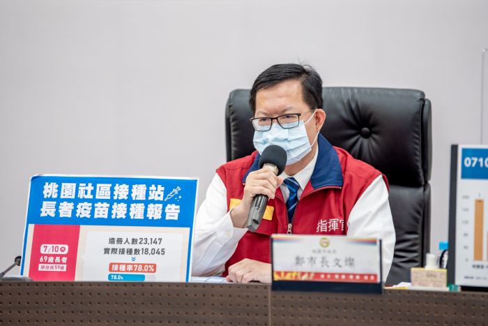 鄭文燦表示,目前桃園75歲以上長者的接種率達83.27%、為全國第一,65歲至74歲的部分接種率為36.63%,也為六都第一。市府持續推動高齡長者疫苗接種計畫,今日辦理69歲長者及原住民59歲長者疫苗施打,總計造冊2萬3,147人、已接種1萬8,045人、施打率達78%,其中不在籍者820人,另有834人補打疫苗。