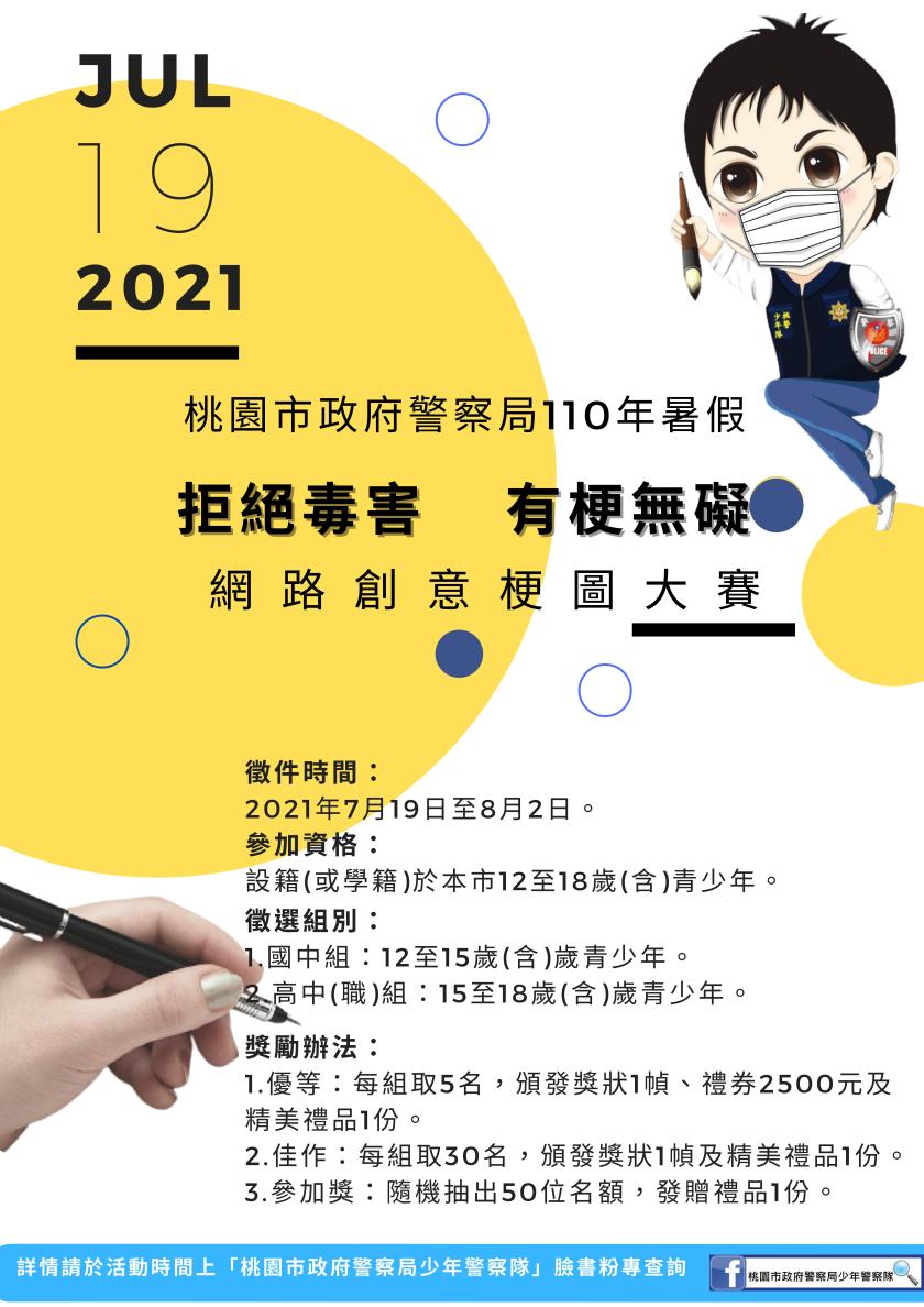 110年暑期保護青少年─青春專案期間,因應COVID-19疫情仍嚴峻,為兼顧防疫及鼓勵青少年從事正當休閒活動,桃園市政府警察局於110年7月19日至8月2日特別規劃「拒絕毒害有梗無礙」網路創意梗圖大賽活動,邀請防疫宅在家的年輕學子線上參與投稿,競賽優選得主最高可獲得2,500元禮券及價值500元禮品1份。