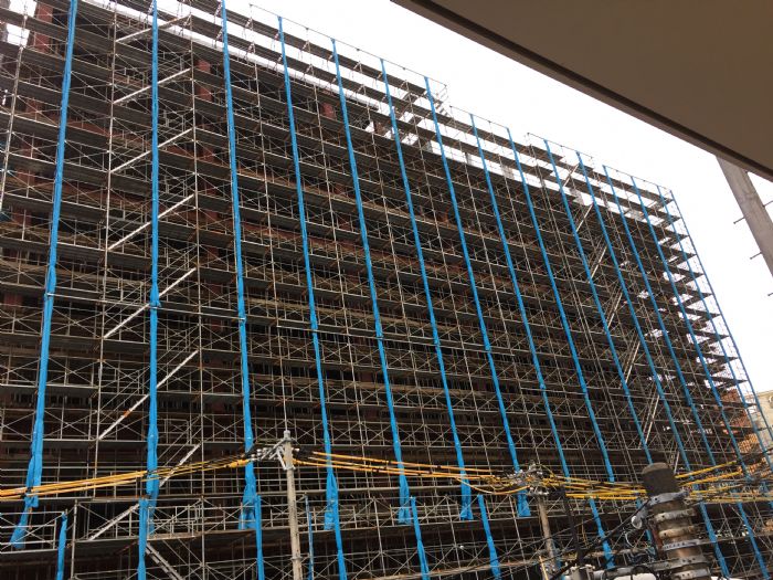 施工架上張掛之帆布或廣告物在強風來襲前亦應暫時拆除,減少受風面積等預防措施以增加穩定性,以免風壓太大,使施工架無法承載、倒塌而傷人,並於強風、大雨前停止作業;土方開挖工程須做好擋土設施及排水工程,並增置砂包,防止防雨水灌入,以避免積水而導致鄰房地層下陷坍塌或傾斜,鄰近河岸工程或臨水邊坡等作業應儘早完成撤離,靠山區坡地工程須留意水位暴漲或土石流及坍方落石的發生,儘早做好防颱安全措施,應建立作業連絡系統、選任專責警戒人員及準備救生衣、救生圈及動力救生船等設施,以備救援。