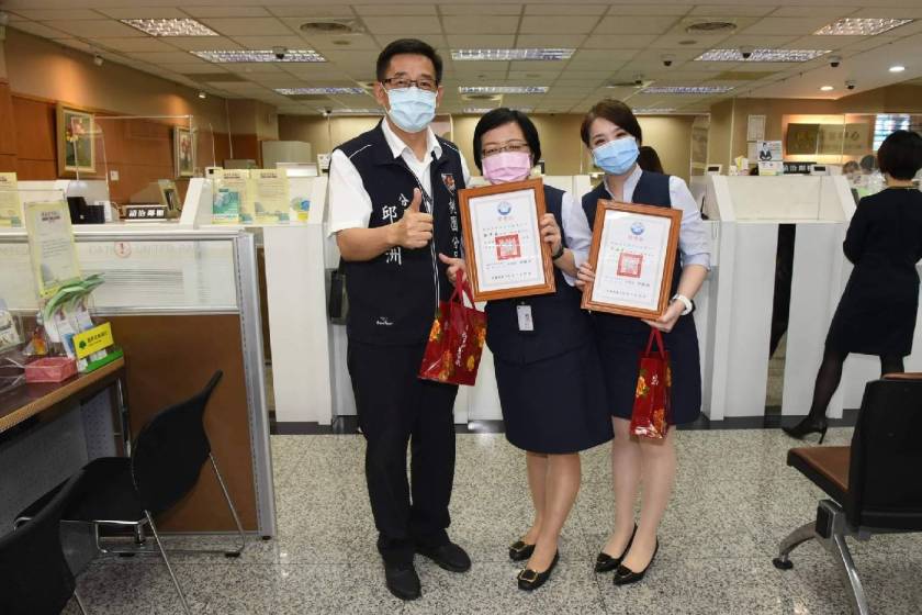 分局長邱紹洲頒贈榮譽狀給鄭秀菊經理及李涵君辦事員