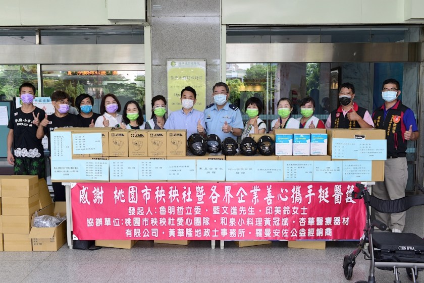 桃園各界善心團體愛心人士,以及退役榮民袍澤大家有錢出錢,有力出力,慷慨解囊,共同集資,募捐醫療用防護面罩101具,醫療用隔離衣650件給第一線醫護同仁使用;杏華醫療器材公司也捐贈帶輪型助步車2台,提供給陶然園日照中心長輩運用。