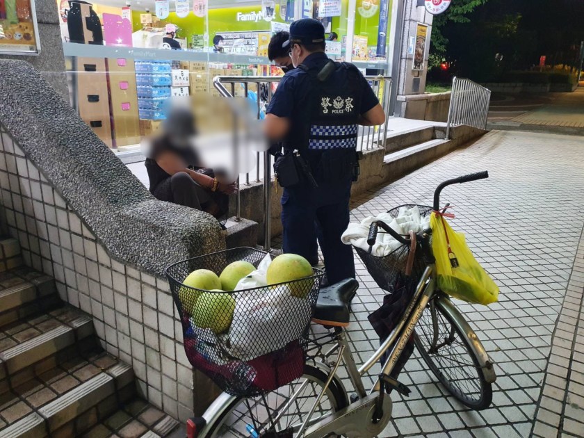 原來徐姓婦人居住於新北市新店區,因身份證及健保卡遺失無法領取國民年金,30日上午8時騎乘腳踏車欲至新店區公所辦理補發,途中婦人想到中秋節快到了在路邊水果行買了4顆柚子(100元)竟不慎搭乘台鐵區間車至桃園火車站,才走出車站遇到午後大雷陣雨,人生地不熟的徐婦心急盲目騎著腳踏車尋覓躲雨處所,偏偏徐婦的腳踏車老舊、輪胎沒氣,讓婦人躲雨途中不慎摔倒,最後騎的精疲力盡,剛好騎到龜山區陸光路(全家便利超商),徐婦全身疲憊又無助癱坐在樓梯上。