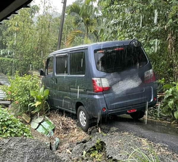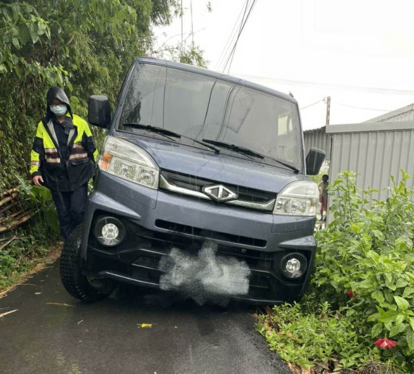 桃園警察分局同安所警員簡煒哲、黃政賢及劉曼竹1日16時許,接獲民眾報案,表示峨嵋四街的小徑有車輛可能因天雨路滑而滑出路面卡在坡坎上,致使該路段無法通行。