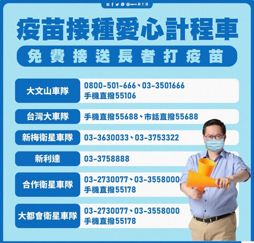 鄭文燦也說,桃園市招募合作衛星車隊、新利達衛星車隊、大文山衛星車隊、大都會衛星車隊、新梅衛星車隊及台灣大車隊等6家車隊,組成疫苗接種愛心計程車服務,提供市民安心、貼心的服務,讓市民有感,也協助提升疫苗接種率,另復興區原鄉因經營環境特殊,且路程較遠,由當地個人計程車提供接送當地長者與孕婦的接種服務。