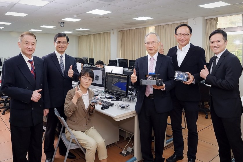 中原大學打造全台首創AI機器人5G專網實驗室。中原大學前校長張光正、桃園市政府副秘書長邱俊銘、鴻海科技集團副總裁呂芳銘、凌華科技董事長劉鈞(左起)等人與學生合影。