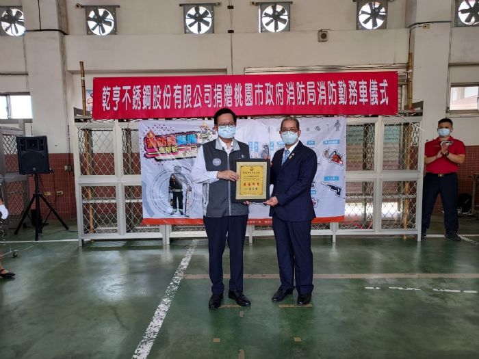 桃園市八德區乾亨不銹鋼股份有限公司莊福順董事長,長期都在地方扶助弱勢團體、熱心公益,這次感念消防人員辛勞捐贈桃園市政府消防局消防勤務車兩部,供消防局第一大隊及八德消防分隊使用。