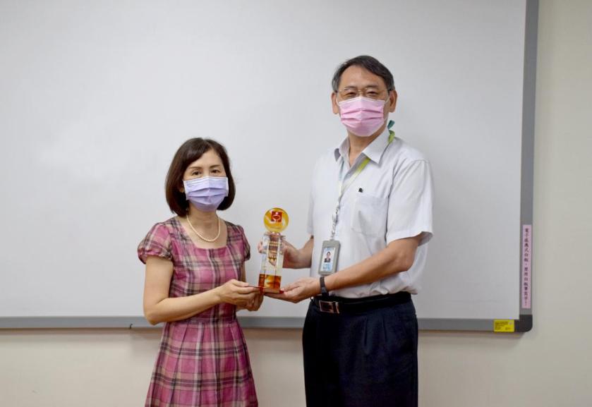 勞動部勞動力發展署桃竹苗分署竹北就業中心就服員葉麗燕(左)榮獲今年度勞動部最佳雇主服務人員殊榮,與桃竹苗分署長賴家仁合影。