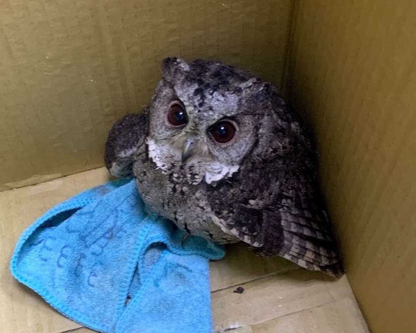張姓民眾26日18時許在龜山區中興路90巷市民農場附近散步中拾獲領角鴞(俗稱:貓頭鷹),員警撥打市民專線1999通知動保處,今日始能派員前來,員警準備紙箱讓它休息,再上網查詢貓頭鷹習性、照料方式,眼睛大大的小貓頭鷹,雖然只見牠睜大眼睛,對這個世界相當好奇的模樣,讓大家的心都被融化了,「貓頭鷹」是「鴞形目」多半在夜間活動稱作夜行性猛禽,簡稱「夜猛禽」。