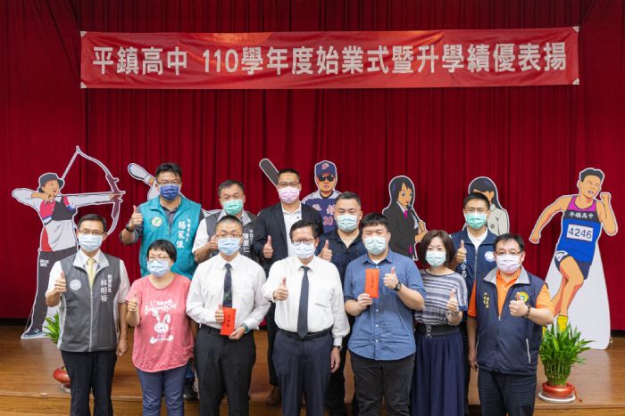 桃園市長鄭文燦31日上午前往平鎮區,出席平鎮高中110學年度始業式暨升學績優表揚活動。鄭市長表示,平鎮高中是市立高中的亮點學校,在體育、音樂、才藝、社團及升學等方面多元發展,表現都十分優異,今日大學指考放榜也交出好成績,有兩位同學考取醫學系,分別為張福臨同學錄取台大醫學系,劉柏漢同學錄取中國醫藥大學醫學系。鄭市長在線上始業式中,期許平鎮高中的同學,能以兩位學長的學習態度作為榜樣、逐夢踏實,在學校裡快樂學習、結交好友,並與師長保持良好互動;桃園也將持續發展市立高中整體教育,改善硬體讓教學品質不斷提升,以多元學習環境激發學生潛力,達成適性揚才的目標。