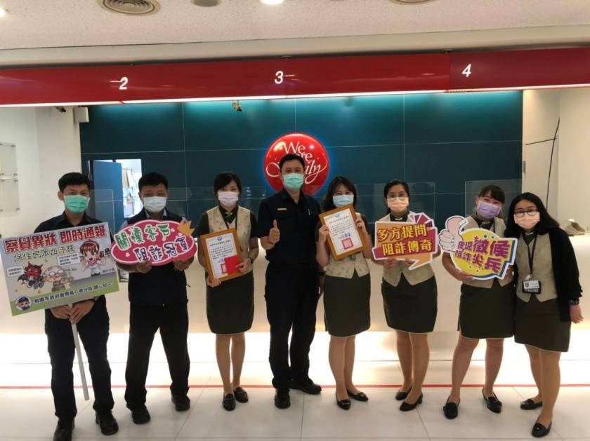 八德分局為感謝銀行行員協助攔阻民眾遭詐騙匯款,由吳副分局長率偵查隊副隊長蔡志鳴、四維派出所副所長黃信銘等,9日下午4時至轄內國泰世華銀行大湳分行、中國信託八德分行,頒發感謝狀及禮卷,表揚阻詐有功的金融機構行員,本次表揚共三案,成功守住民眾血汗錢共新台幣32萬4千元。