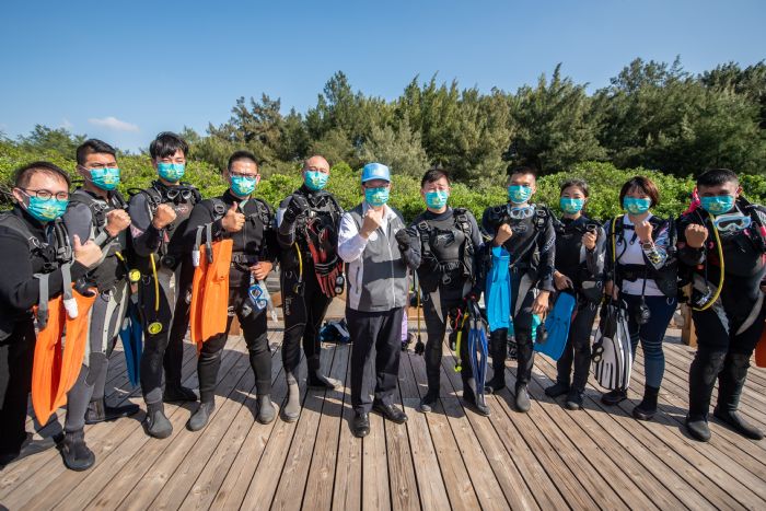 鄭文燦表示,為提升潛水隊員的榮譽感及凝聚向心力,市府創全國之先建立「績優授階獎勵制度」,凡潛水志工每年淨海3次,即可晉升為一星淨海潛將,服務滿15次最高可晉升至五星潛將,今(110)年將有14名績優隊員獲得授階表揚。此外,為讓環保潛水隊的潛水設備更加精良,今(110)年市府已獲海保署補助20套潛水裝備,明(111)年將再購置8套潛水設備,並加碼運用160萬電協金添購潛水裝備,希望支持環保潛水隊的努力。