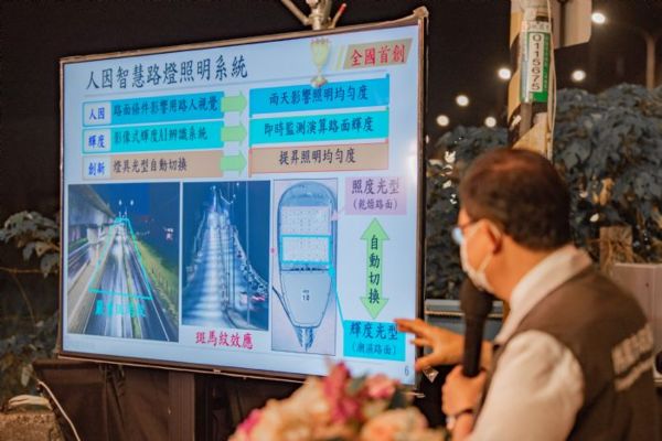 鄭市長指出,過去傳統水銀路燈,在雨天路面積水時容易形成反光及路燈照明不均勻等問題,可能令駕駛人視覺疲勞,影響路況判斷。市府在鄰近桃園棒球場旁的高鐵南路三段及過嶺重劃區周邊的高鐵南路五段,分別布建24盞智慧控光型路燈與100盞輝度型路燈,建構「人因智慧照明路燈系統」,運用智能LED路燈結合影像式輝度計與智慧光型控制技術,即時監視道路表面輝度狀態,自動切換燈具照度與輝度的光型,以提高用路人視覺舒適度。