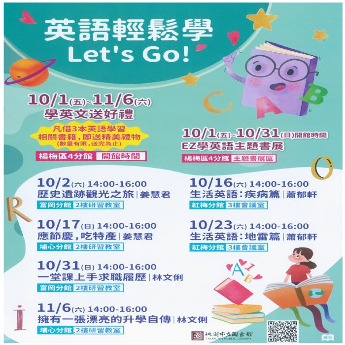 你覺得自己的英語好嗎?英語作為重要的國際語言,經常是升學或求職的必備條件之一。桃園市立圖書館為提升大家對英語學習的興趣,10月起特別在楊梅分館舉辦「英語輕鬆學Let’s Go!」系列活動,提供輕鬆無負擔的學習課程,透過名師講解與生動有趣的學習環境,增進英語學習能力。活動除了講座課程以外,還特別辦理「EZ學英語」主題書展及「學英文送好禮」等精彩活動,歡迎大家踴躍報名參加!
