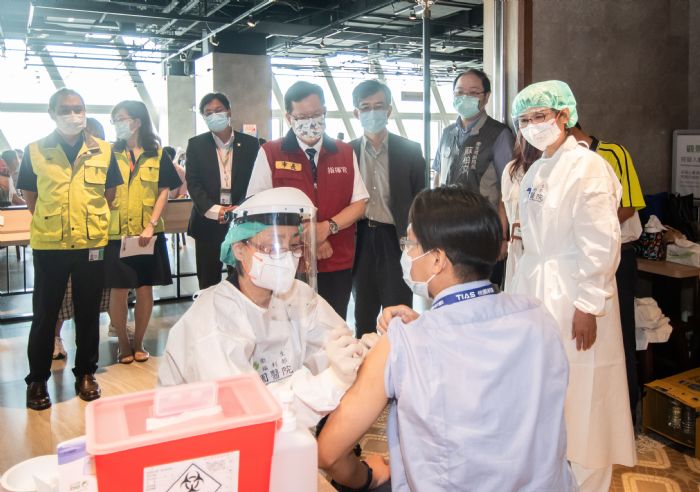 鄭文燦特別感謝衛福部桃園醫院團隊提供友善、貼心、專業的接種服務,相信會讓機場從業人員安心,而有關機場防疫動線、個人防護等防疫物資的需求,市府也會以最高標準給予機場最大的支持。