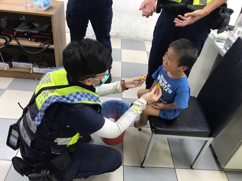 賴姓男童被路人發現後,立即報警協助,員警獲報趕抵現場,並安撫男童情緒,無奈男童年幼,無法清楚表達語意,員警只好先將男童帶回駐地,充當臨時保姆照料男童,除了提供小點心及果汁外,也耐心陪男童聊天,分散緊張的心情。因為男童只有2歲多,員警研判應該住在不遠處,除了請里長協助廣播協尋外,也拿著男童照片在附近搜尋。