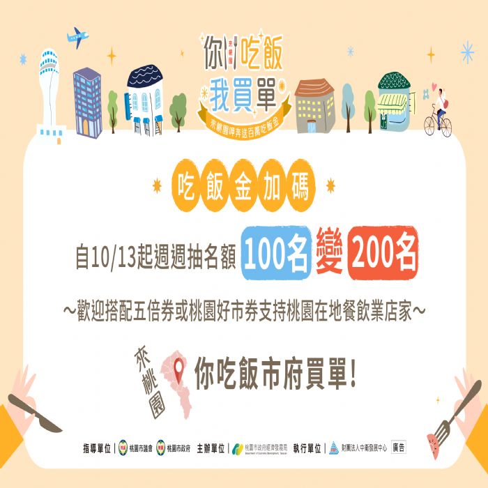 桃園市政府9月推出的振興暖身「你吃飯‧我買單」送百萬吃飯金活動,週週送出100名吃飯金,為響應中央振興5倍券發行,(8)日宣布每週再加碼100名,週週送出200名,好康一波接一波,趕快來桃園吃飯,吃越多賺越多。