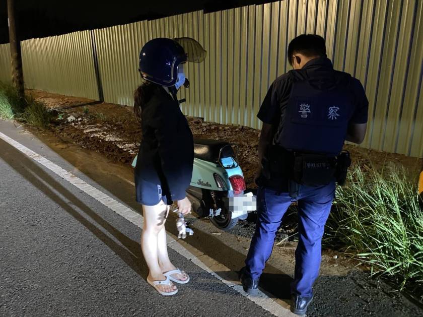大園分局草漯派出所警員劉冠廷、蕭凱於15日23時許,巡邏行經新生路時,發現一名女子站在路邊揮手求助,員警見狀立即上前關心。邱女向警方表示,她剛從朋友家離開,準備要騎車返家,但在半路上機車突然拋錨熄火,怎麼發都發不動,她的手機又不小心忘在朋友家中,因此無法找人幫忙,一時不知該如何是好。