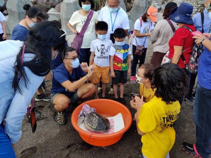 大園海口海岸巡護隊於去(109)年10月底在沙崙礫灘上發現一隻受困於麻布袋纏繞的小欖蠵龜,體表有多處的傷口,經獸醫初步診斷患有貧血及消化道功能不佳,後交由臺灣海洋大學專業團隊收容照護,並為牠取小名-南瓜蛋餅,經過長達近一年的照護,體重從500克重快速成長到4200克,經專業團隊審慎評估後,認為南瓜蛋餅已重新回復健康,所以決定於16日在基隆潮境公園野放,讓牠重返大海的懷抱。