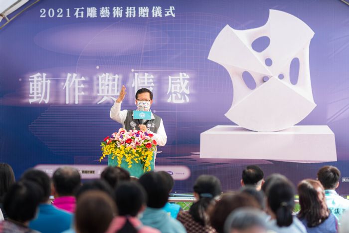 桃園市長鄭文燦(19)日下午前往桃園展演中心,出席「《動作與情感》國際雕塑作品捐贈揭幕儀式」。鄭市長表示,明基基金會捐贈的國際雕塑作品《動作與情感》(Motion and Emotion),由保加利亞藝術家彼德.培洛夫(Petre Petrov)所創作,其因體認到運動及旅行都能讓人們感到滿足與快樂,因此以白色大理石材質進行雕塑,透過作品傳達在旅行中感受的快樂與滿足,近距離觀賞石雕藝術作品時,不但能感受到生命與大地之中沉靜的美感,也能與周邊桃園展演中心、藝文商圈及明(111)年即將落成的桃園市立圖書館新建總館互相呼應,期盼這片以雕塑作品點綴的草坪綠地,成為市民舉辦活動及休閒的最佳場所。