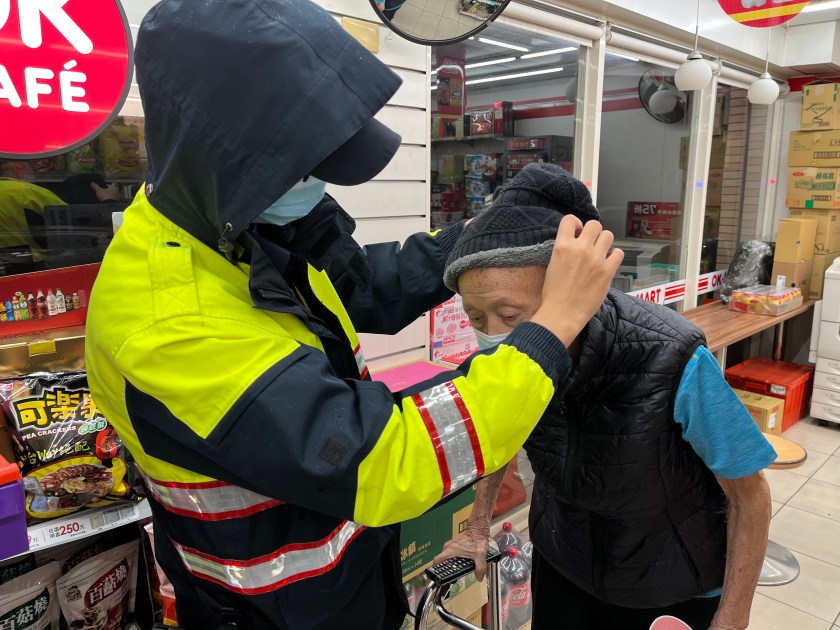 所幸龍岡派出所警員周宗平及劉康儀巡邏經過,見老翁臉色發白,且深夜時間獨自待在超商,員警察覺有異,立即上前關心,但老翁面對員警詢問,完全無法表達詞意,員警只好先將老翁載回勤務駐地,並遞上熱食及茶飲供老翁補充體力、稍作休息。