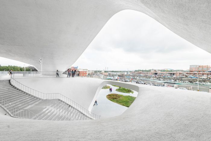 「永安海螺文化體驗園區」從發想到工程施工都是獨一無二,充分融入海洋、客家、生態等元素,其中屋頂採取無柱曲面模板的建造方式,工程難度極高,感謝工程團隊的努力,克服高難度的工程挑戰,相當不容易。