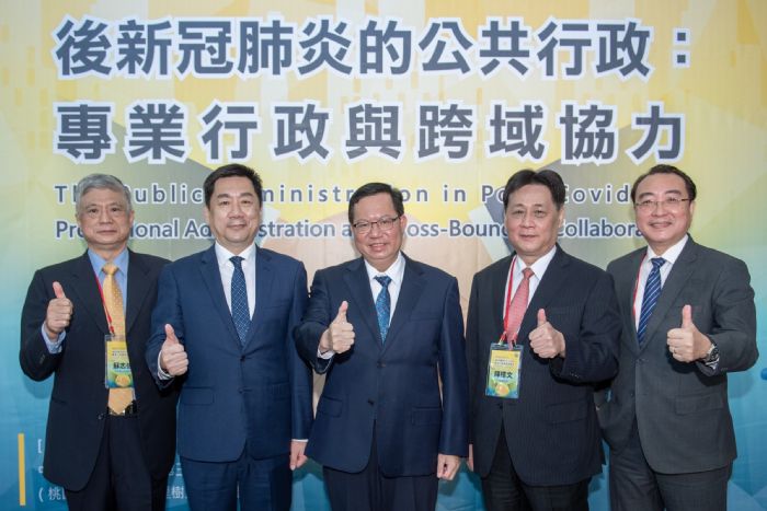 桃園市長鄭文燦5日上午前往中央警察大學,出席「2021年台灣公共行政與公共事務系所聯合會年會暨國際學術研討會」。針對本次研討會主題「後新冠肺炎的公共行政:專業行政與跨域協力」,鄭市長表示,台灣防疫之所以成功,其中跨領域、跨機關、中央與地方之間的合作非常重要,除了建立起醫院防線,台灣用科技、文明、友善的方法,警消衛環民政系統協力合作,落實匡列、隔離等非藥物介入措施,成功阻斷疫情傳播鏈,建立社區安全防線。台灣的防疫經驗值得公共行政領域探討,希望透過研討會與國際分享台灣經驗、讓台灣在公共行政領域做出更多貢獻。