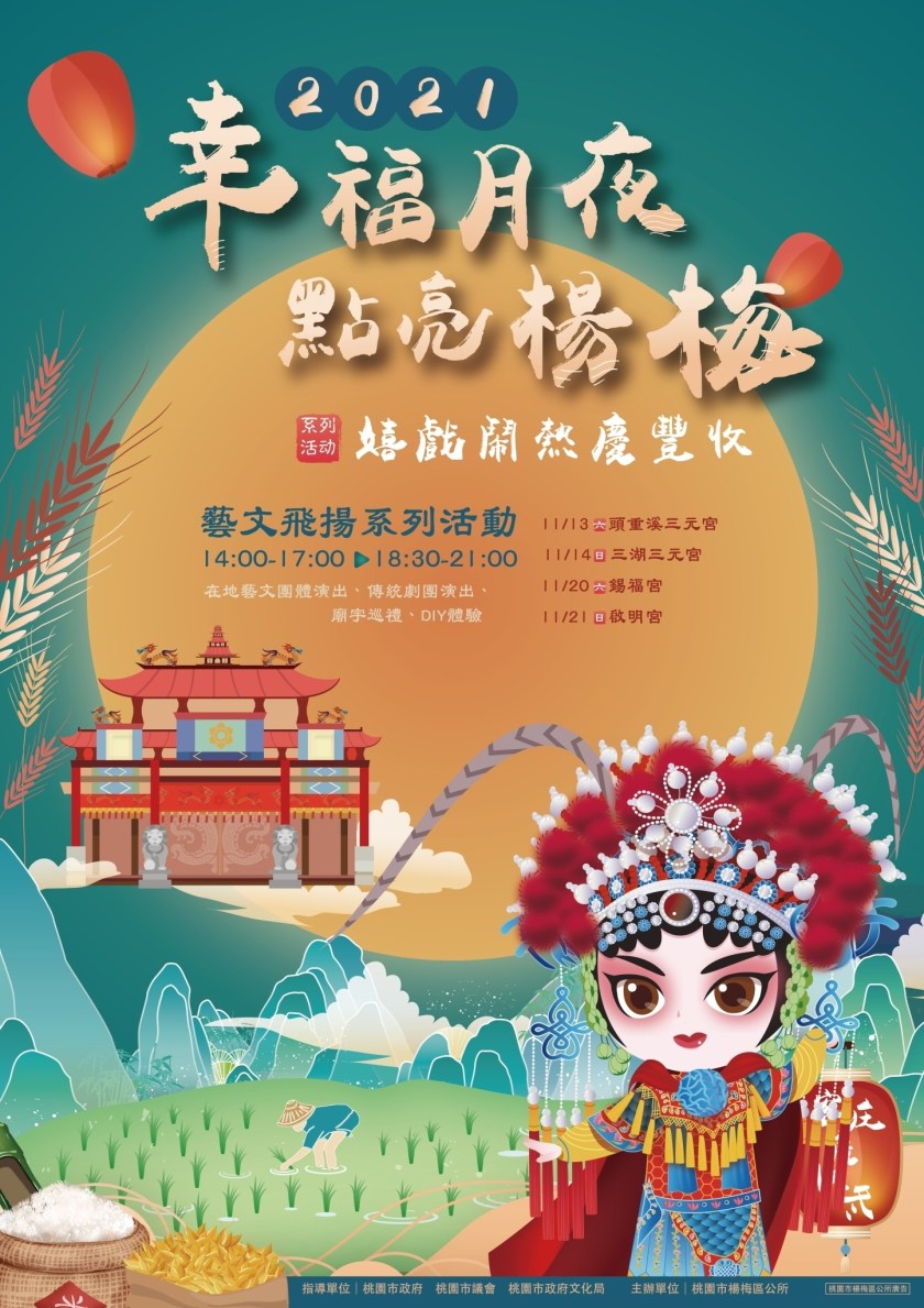 楊梅區公所主辦的「幸福月夜.點亮楊梅」系列活動,已成為楊梅區的大型活動盛事,每年皆吸引許多在地民眾參與。今年受疫情影響,許多活動延期舉辦甚至停止辦理,在疫情趨緩之際,公所以客家農曆十月收冬還福,以「嬉戲鬧熱慶豐收」為主題,在頭重溪三元宮揭開活動序幕,接續分別於三湖三元宮(11/14)、錫福宮(11/20)及啟明宮(11/21)舉辦共4天的藝文飛揚系列活動。