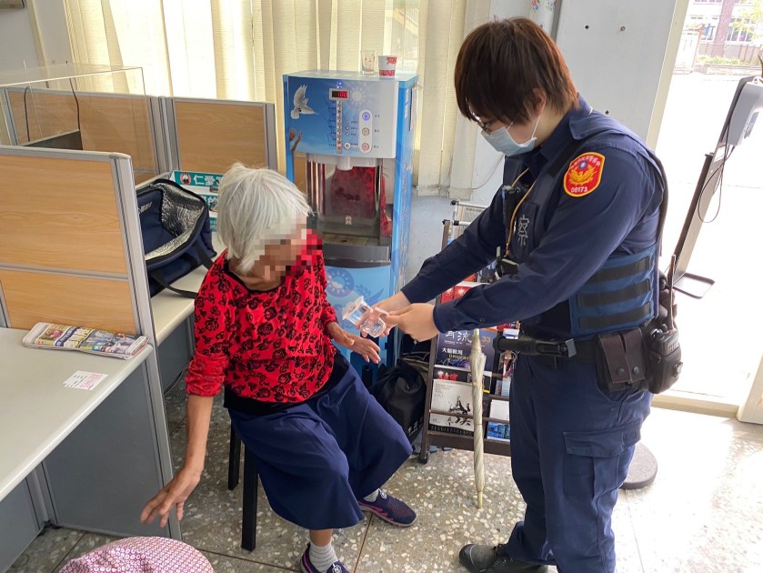 恰巧警員王鈞民及黃筠庭巡邏經過,發現走在路上的老婦人神色有異,趕緊上前關心詢問,無奈老婦人面對員警詢問,完全無法清楚表達語意,員警見老婦人臉色發白,疑似體力透支,於是趕緊先將她暫時帶回派出所安置,並提供飲水及熱食讓她補充體力,稍作休息。