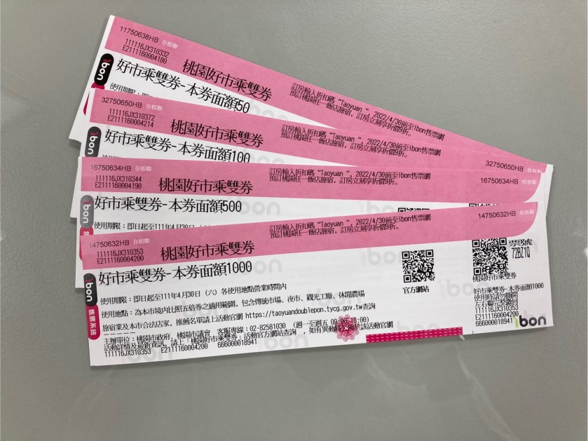 桃園市政府搭配中央振興五倍券推出「桃園好市乘雙券」23.3萬份(含加碼好客券2,000份),獎項包含200元換400元(10萬份)、500元換1,000元(10萬份)、1,000元換2,000元(3萬份)、5,000元換1萬2,000元(1,000份)及好客券500元(2,000份)。
