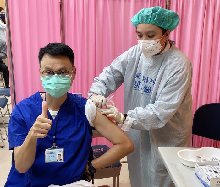 今天由桃園醫院感染科林宜君主任領導之疫苗接種團隊評估及協助疫苗注射,提升安全性,桃園療養院接受疫苗接種員工表示該團隊服務態度親切有禮,讓自己安心及放心。桃園療養院呼籲民眾可透過「COVID-19公費疫苗預約平台」預約接種或到各地方政府衛生局合約醫療院所預約疫苗接種。