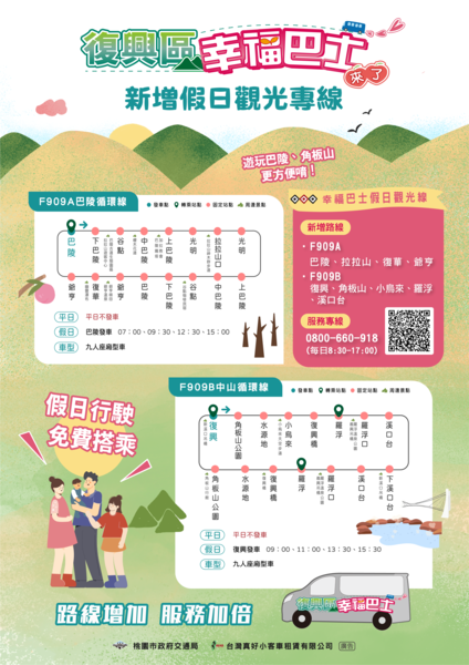 為滿足偏鄉地區基本民行的交通需求,並振興觀光產業,桃園市政府交通局於復興區推動幸福巴士計畫,除平日闢駛6條公車路線外,自11月13日起,每逢假日行駛「【F909A】巴陵循環線」及「【F909B】中山循環線」等2線免費觀光公車,以串聯角板山公園、小烏來、羅浮溫泉公園、幽靈瀑布等熱門景點,鼓勵民眾搭公車,暢遊復興。