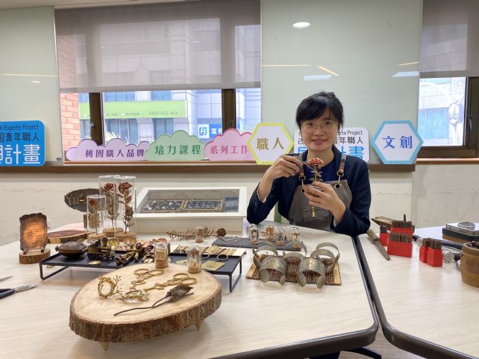 由桃園市政府青年事務局青年職人計畫輔導的青年職人-呂浴珊,作品以金屬、銅工藝創作為主,並擅長以溶蝕、異媒材排列等組合技法創作。創作純熟、金工作品剛柔並濟的她,並非美術科班出身,直到高中升大學的考試,才喚起內心對藝術的夢,在自行練功進入藝術大學學習後,於課程中接觸到立體媒材創作,從此讓浴珊躍身投入金工創作,成為一名金工創作職人。