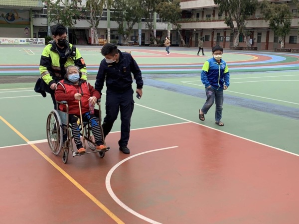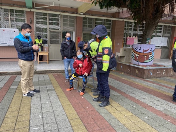 婦人在投完票後突然感覺身體不適腳軟,警方攙扶婦人先在旁休息,向校方商借輪椅供婦人使用,同時通知派出所巡邏員警劉心妤、陳冠宇將婦人護送返家休息。