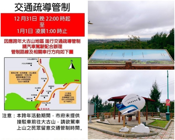 今年12月31日跨年夜當晚,為避免大量人車上山,造成大古路壅塞及回堵情況,桃園市政府警察局蘆竹分局已規劃交通疏導管制措施準備因應。12月31日當晚22時至隔日1時,大古路段將實施單向交通管制,禁止除具通行證以外之車輛上山(機車、自行車不管制)。另提醒民眾,因今年跨年活動期間相關客運業者已無提供接駁服務,如欲駕車上山之民眾請留意交通管制時間。
